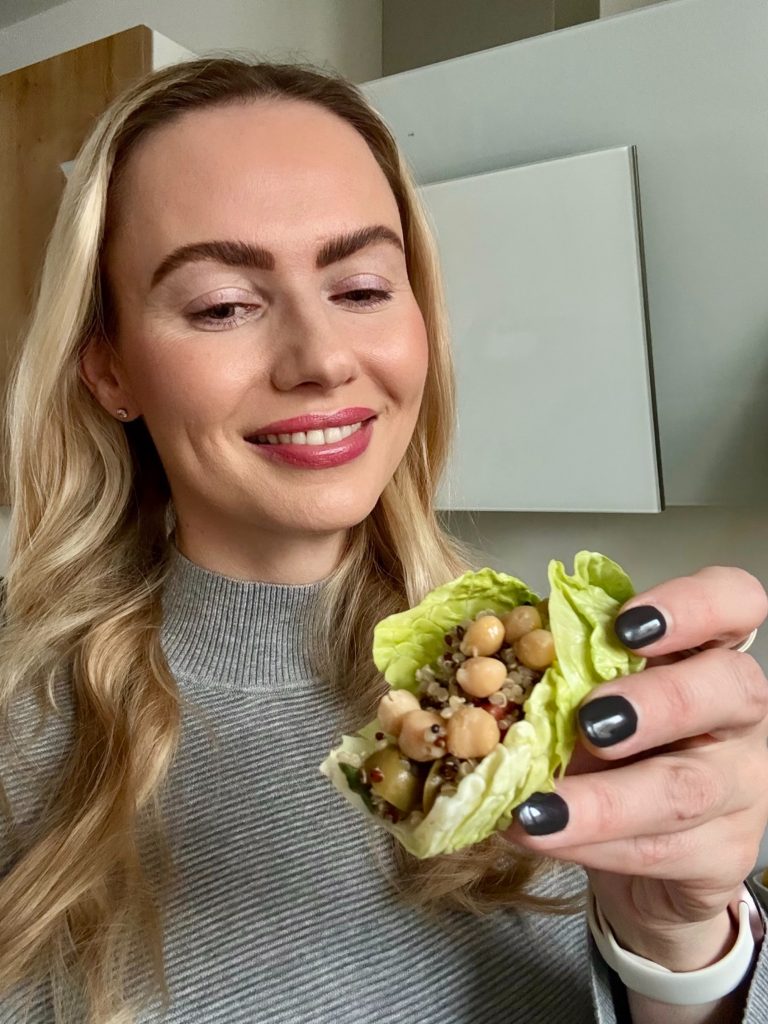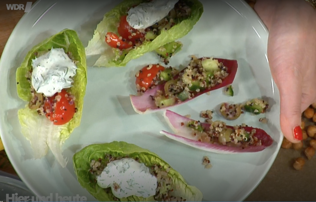 Am Aschermittwoch den 18.02.26 war ich in der WDR Sendung hier und heute und habe als Ernährungsexpertin verschiedene Fasten-Techniken vorgestellt. Damit es nicht nur um “trockene Theorie” geht, habe ich auch ein lecker-leichtes Rezept zubereitet, was super in die Fastenzeit passt. Und zwar Salat-Schiffchen mit Quinoa-Salat. Reich an Gemüse und Salat, aber auch an Protein durch die Kichererbsen , den Quinoa und den Joghurt.
